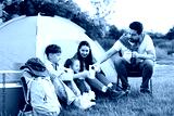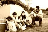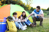 Family spending time together with camping tent, tourist equipment and mugs of hot drink outdoors