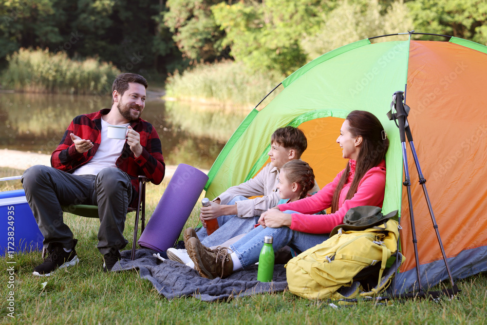 Happy family having break with camping tent, tourist equipment and drinks near river outdoors