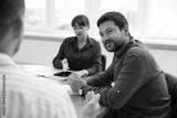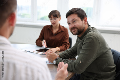 Couple having meeting with business consultant at table in office, selective focus