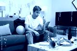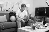 Man with glass of alcohol suffering from hangover on sofa in messy room after party