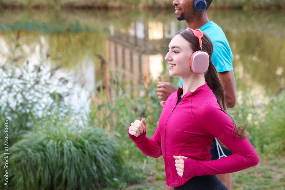 Smiling couple in headphones running near river outdoors, closeup. Space for text