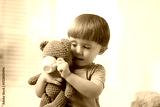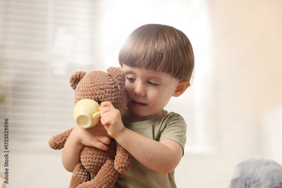 Cute little boy playing tea party with his toy bear indoors