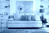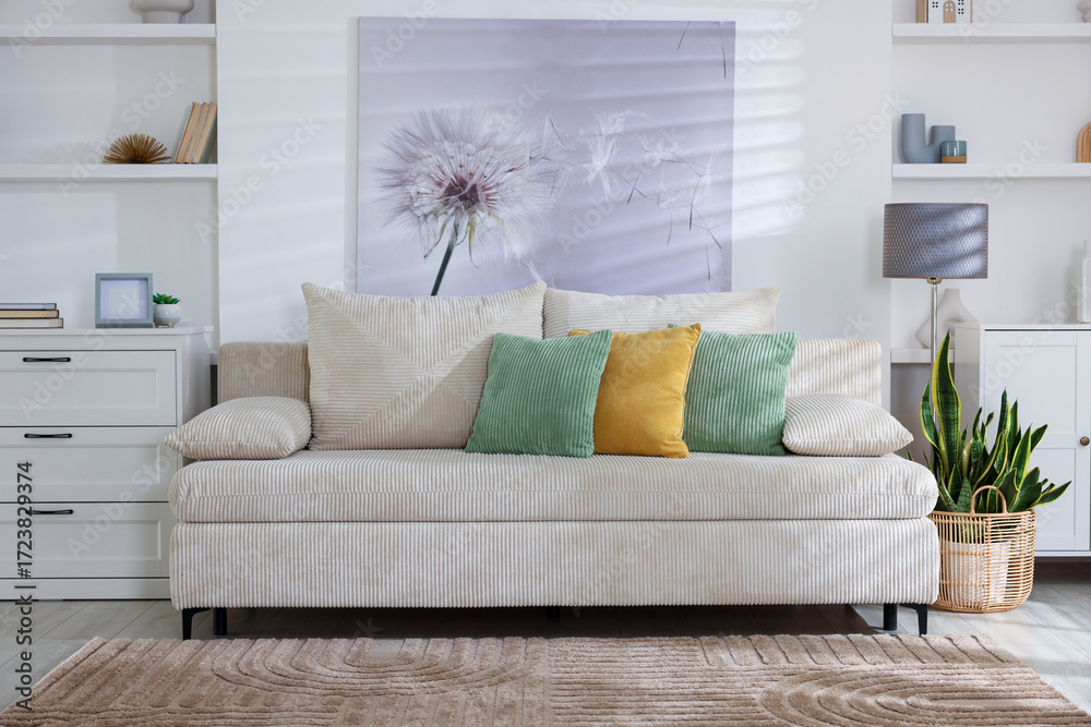Stylish living room with lamp, houseplant and sofa. Interior design