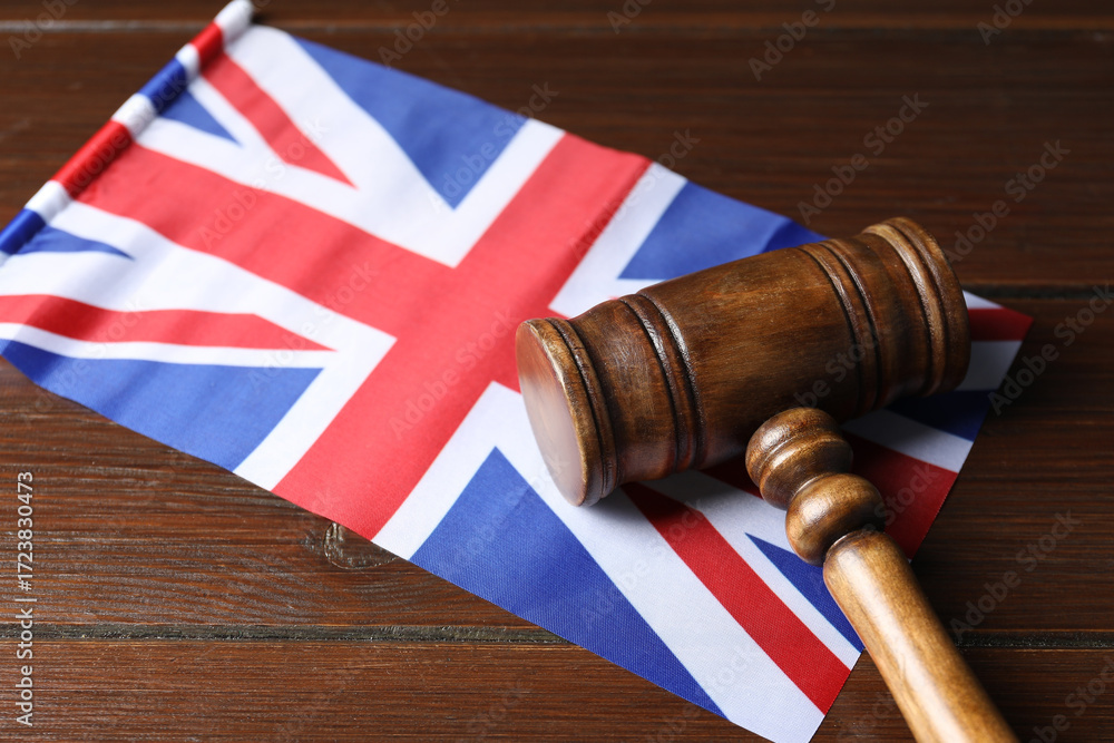 Judge's gavel and flag of United Kingdom on wooden table, closeup