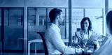 Team mature ceo businesswoman mentor discussing project with young european colleagues on tablet sitting in office. Professional business people working together using technology. Banner, copy space