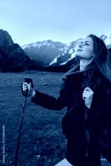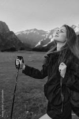 A focused outdoor adventurer is seen hiking with a trekking pole amid a scenic mountain landscape. She looks confident and calm, creating a peaceful and empowering outdoor atmosphere.