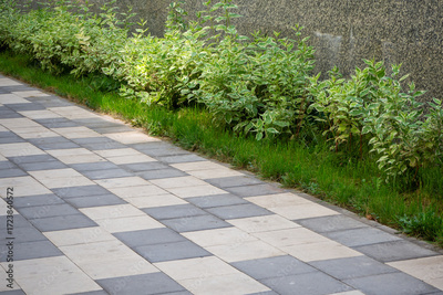 Walkway with alternating paving stones and green bushes along wall. Greening of urban environment. Modern pedestrian path with geometric tiles and fresh plants. Real photo