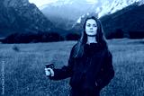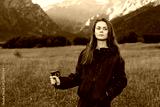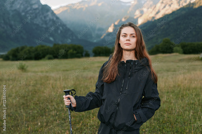 A poised woman stands outdoors in a wide valley with mountains in the distance. She wears a dark jacket and grips a trekking pole, ready for adventure in nature.