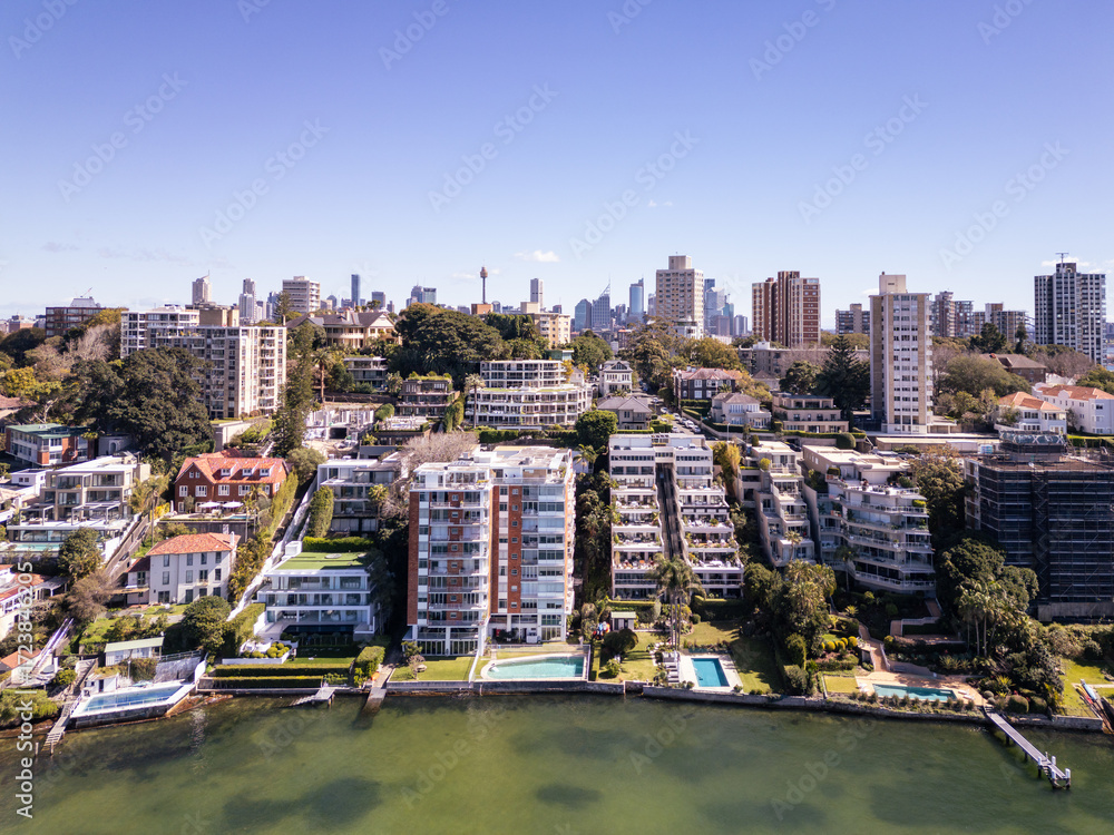 Sydney, Australia: Aerial view of the Elizabeth Bay affluent suburb with luxury houses and apartment towers by the Sydney harbor in Australia