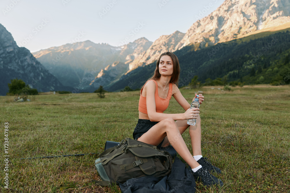 A solitary traveler sits on a grassy meadow in a mountainous landscape, resting with a water bottle beside a backpack, wearing an orange top and shorts, enjoying tranquil natural scenery.