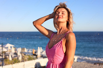 Portrait of beautiful woman near sea on sunny day