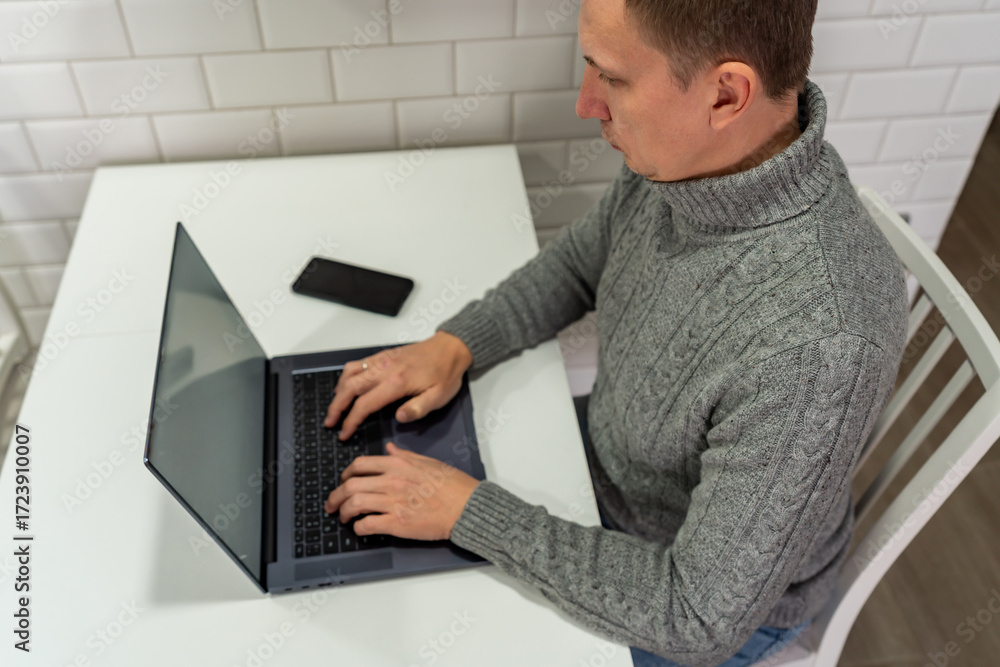 Middle aged man looking at computer screen sitting at kitchen table, using laptop hybrid working, elearning, browsing online relaxing at casual home.