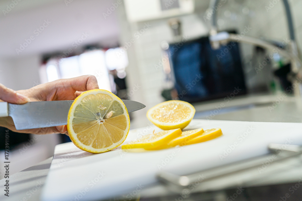 Woman cutting lemon into slices with a sharp utility knife on a kitchen cutting board