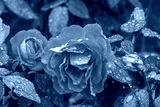 Closeup view of delicate orange red rose flowers blooming outdoors in garden after rain