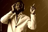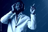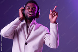 Happy young Black man with headphones dancing to music in stylish beige coat against vibrant purple background, expressing joy and emotion