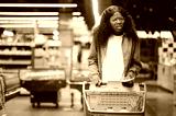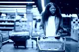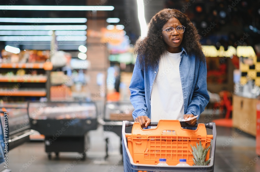 Shocked woman checking a long grocery receipt at the supermarket, expensive grocery and inflation concept