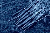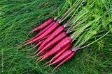 Bunch of bright red organic carrots (Rainbow variety) with green leaves are on the grass lawn in the garden.