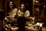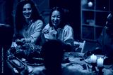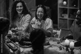 Happy friends enjoying thanksgiving dinner with roasted turkey