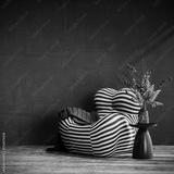 Modern interior design. Armchair with dry plant decoration on purple concrete wall with copy space. 3D Rendering, 3D Illustration
