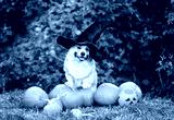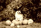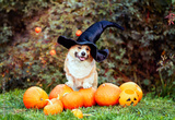 A cute corgi dog in a carnival black cap sits among orange pumpkins in an autumn garden on Halloween.