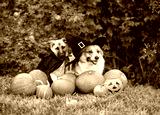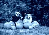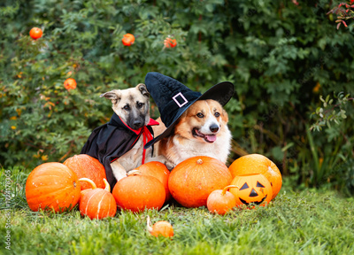 Two funny dog friends in carnival costumes and toques sit among orange pumpkins in an autumn garden on Halloween holiday
