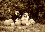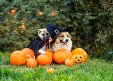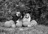 Two funny dogs in carnival costumes and toques sit among orange pumpkins in an autumn garden on Halloween holiday.