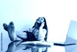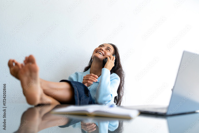 Cheerful middle-aged woman in light blue sweater sitting with legs up on desk, laughing while talking on smartphone, working on laptop with open notebook in bright minimalist home office