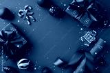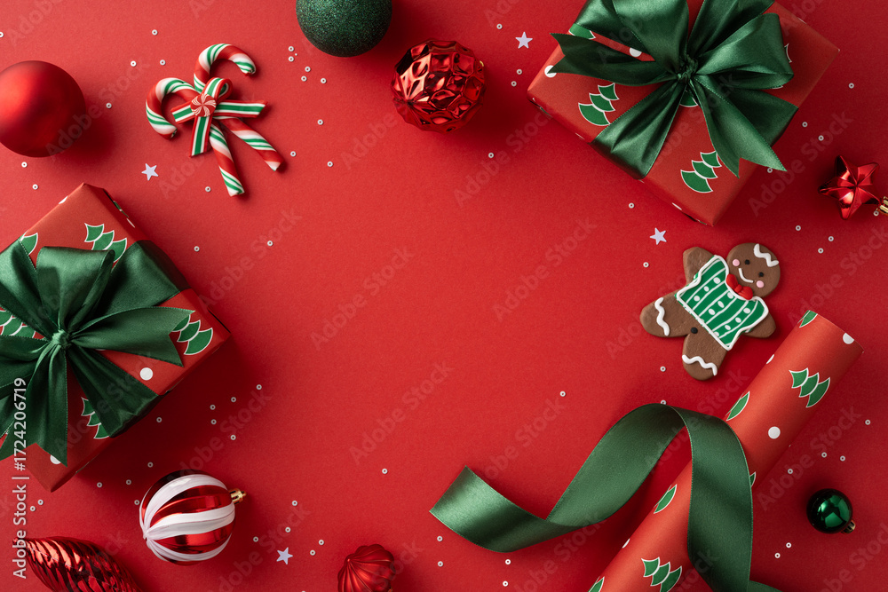 Festive Christmas scene with wrapped gifts, green ribbons, candy canes, gingerbread cookie, and ornaments on a red backdrop Evokes celebration, joy, warmth, and seasonal cheer
