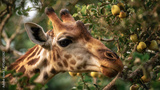 Giraffe browsing on trees surrounded by green foliage and ripe fruits in a natural habitat under soft sunlight creates a serene wildlife scene.