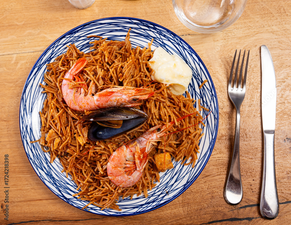 Ready-to-eat seafood paste. Portion of sea pasta cooked with seafood is served on plate. Dish contains prawns, shell mussels, spices and white sauce.
