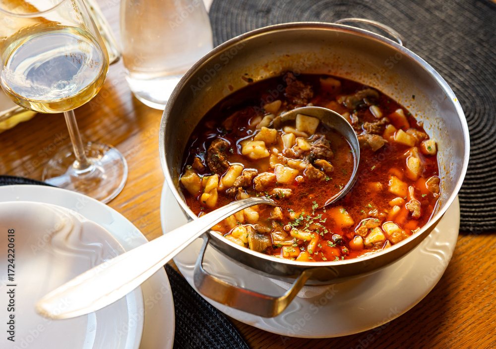 Cobanac, traditional spicy Croatian stew cooked with paprika, tender meat and vegetables, served hot in metal pot with wine in restaurant setting, offering tourists taste of authentic regional cuisine