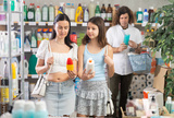 Engaged mother and preteen daughter browsing self-care aisle of supermarket, selecting safe tanning lotion for summer family vacation while dad shopping in background