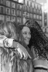 Young women greeting, hugging and smiling in a joyful friendship moment in the city