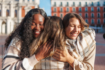 Three diverse women friends sharing a warm hug, smiling with eyes closed in an outdoor setting