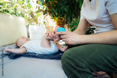 Father massages baby's legs with massage ball. Healthy massage. Massage therapist. Sensory tactile activities. Children health. Massage textured balls for kids. Earlier development. Focus picked.