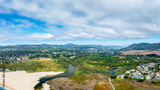 panoramic drone view of Carmel river state beach, California with city and mountains