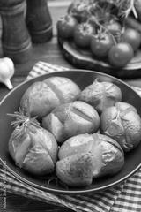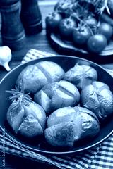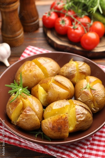 Tasty baked potatoes with rosemary served on wooden table, closeup