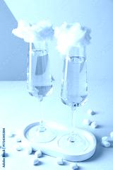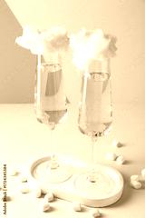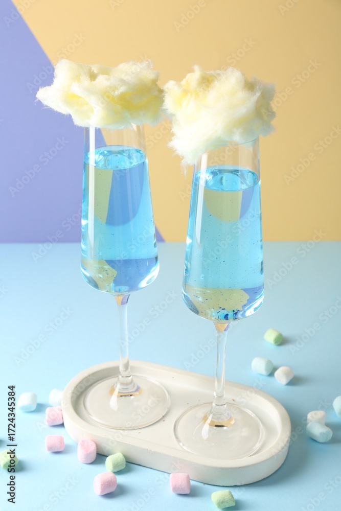 Tasty cocktails decorated with cotton candy and marshmallows on color background