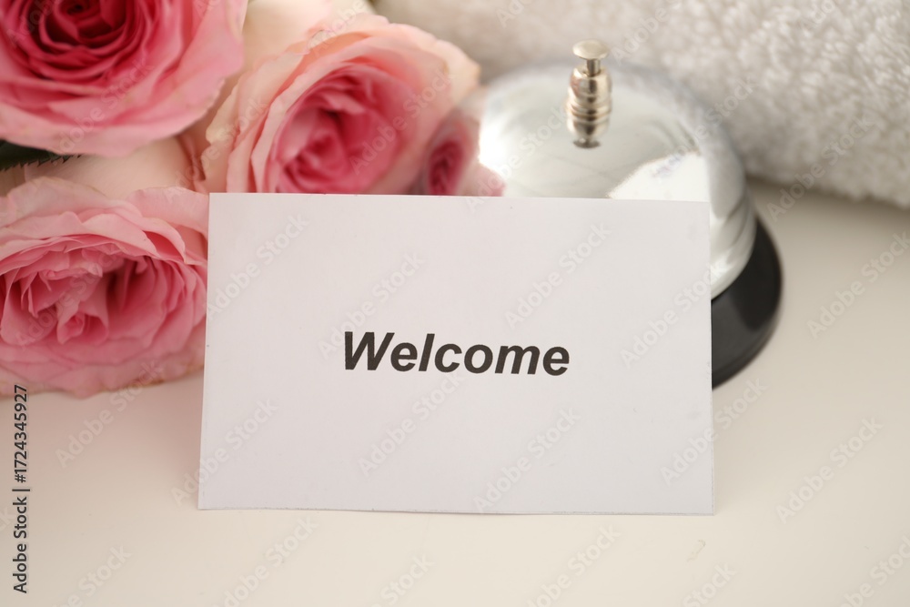 Card with word Welcome, desk bell, roses and towel on white table, closeup