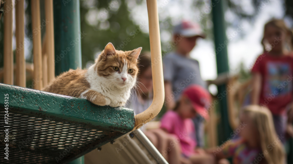 Ginger cat lounging on a playground slide with children playing in the background during a sunny day in a vibrant outdoor setting creating a cheerful atmosphere.