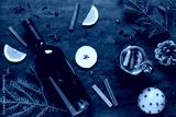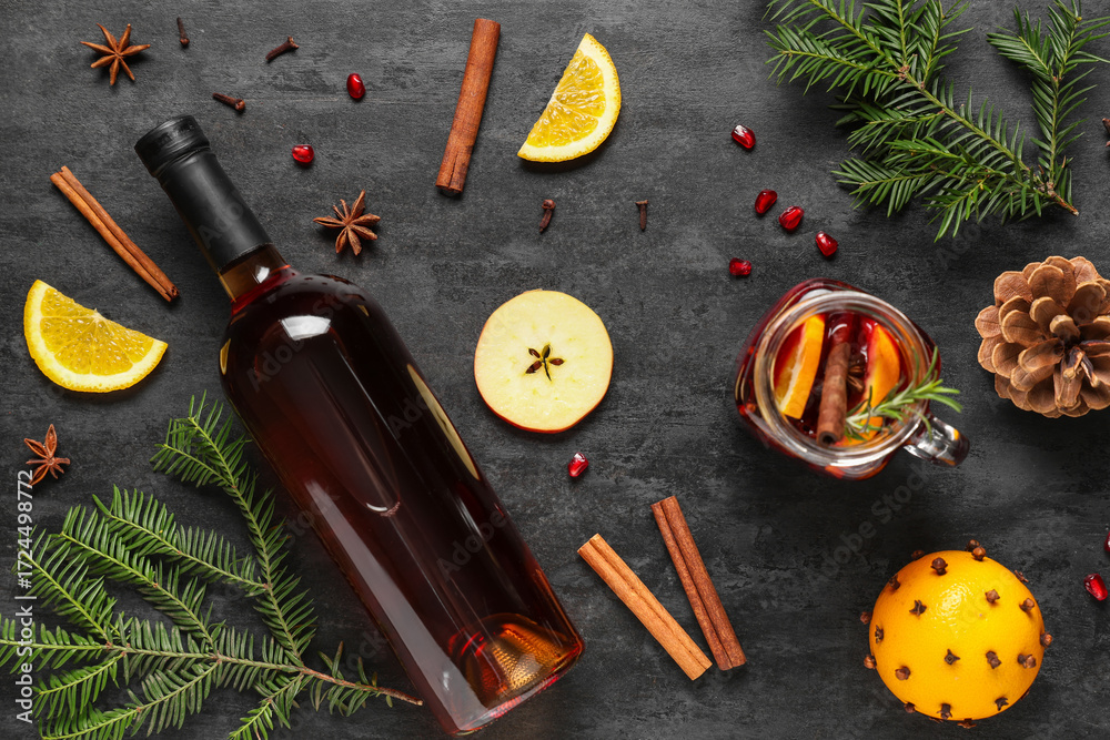 Ingredients, bottle and cup of tasty mulled wine on black grunge background