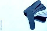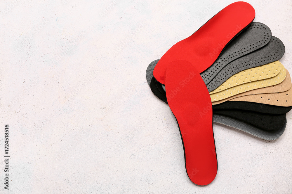 Different orthopedic insoles on light background with space for text