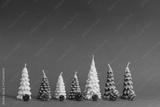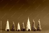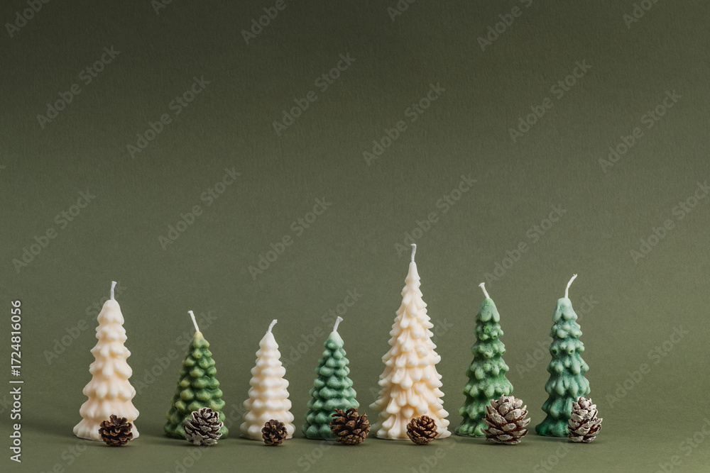 Christmas or New Year background, greeting card. Row of handmade candles in the shape of Christmas trees and pine cones on olive background with copy space.