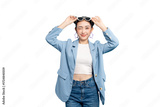 portrait Asian Woman winking and holding sunglasses. She is wearing a blue blazer and denim jeans on PNG