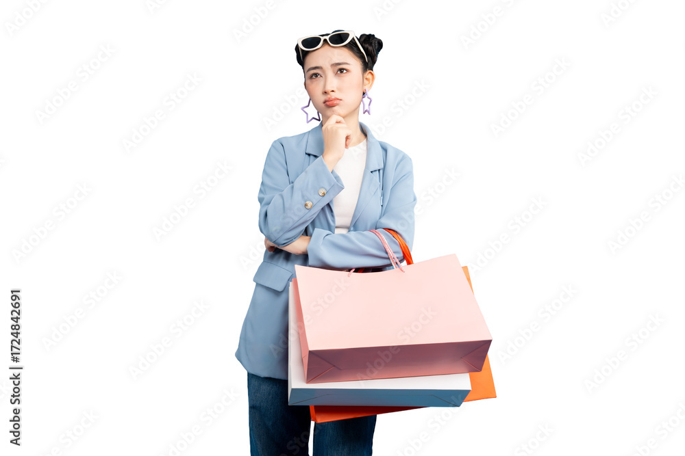 portrait Asian Woman deep in thought while holding shopping bags. She is wearing a stylish outfit and appears to be contemplating her purchases on PNG
