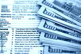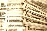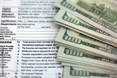 Big amount of United States USD dollar bills banknotes on table with 1040 tax return form