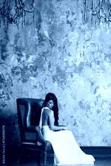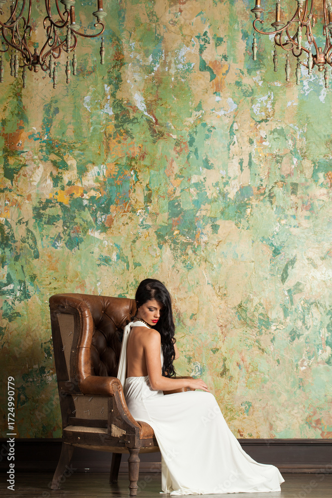 Stylish woman with long hair and make-up sitting in vintage luxurious interior