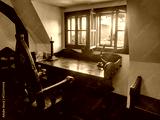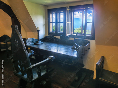 vintage wood furniture Desk at medieval castle bran, interior design, Romanian traditional, Transylvania, Călimani Alps