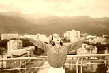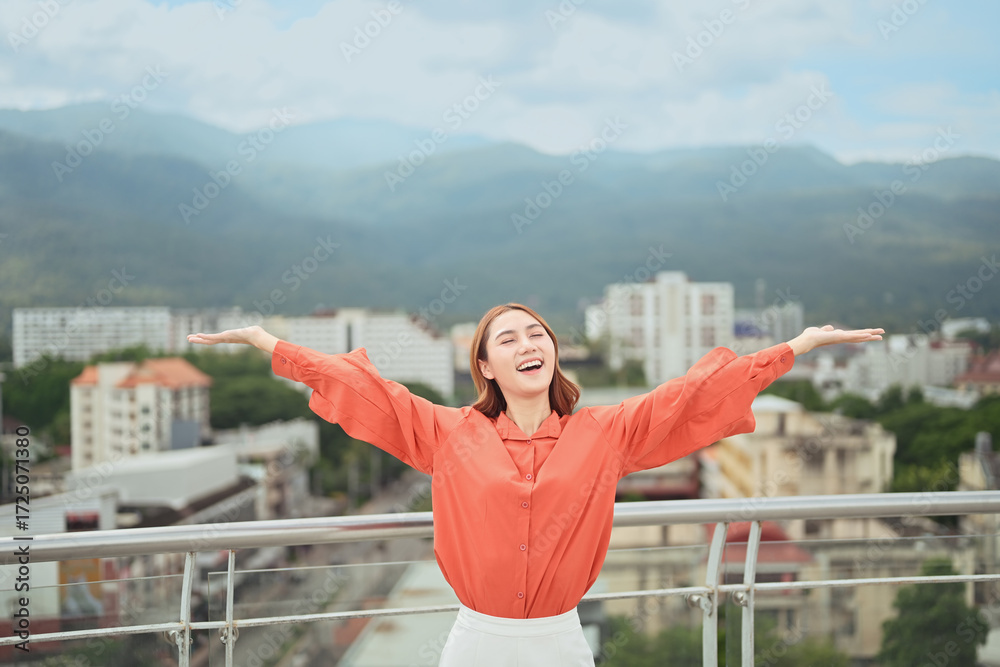 Cheerful businesswoman celebrating success outdoors, smiling with open arms against mountain and city skyline