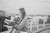 Young businesswoman looking stressed while holding coffee and documents on rooftop city view